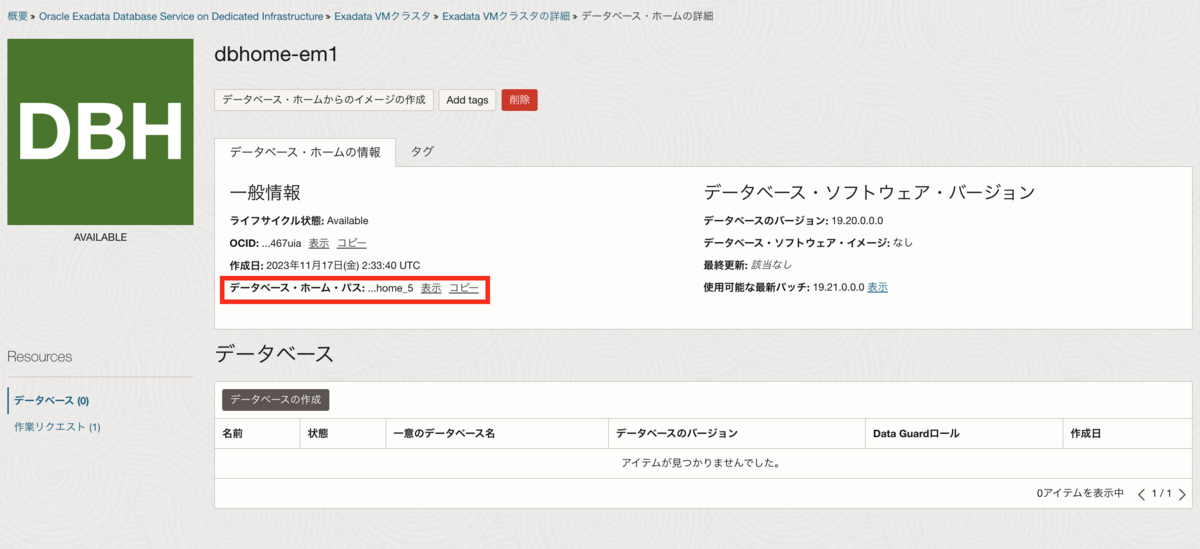 マニュアルには、dbaascli dbHome patchでターゲットのOracleホームを --oracleHome か --oracleHomeName パラメータで指定するように書かれているのですが、コンソールから確認できるのは、--oracleHome = Oracleホームのパスの情報なので、今回は簡単に確認できる--oracleHome を使用します。